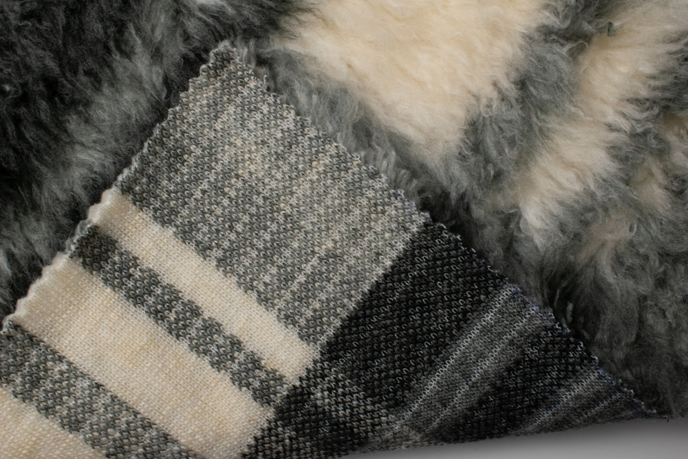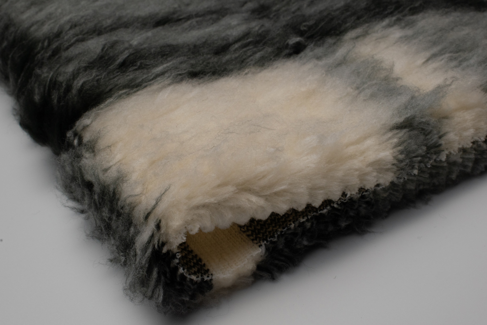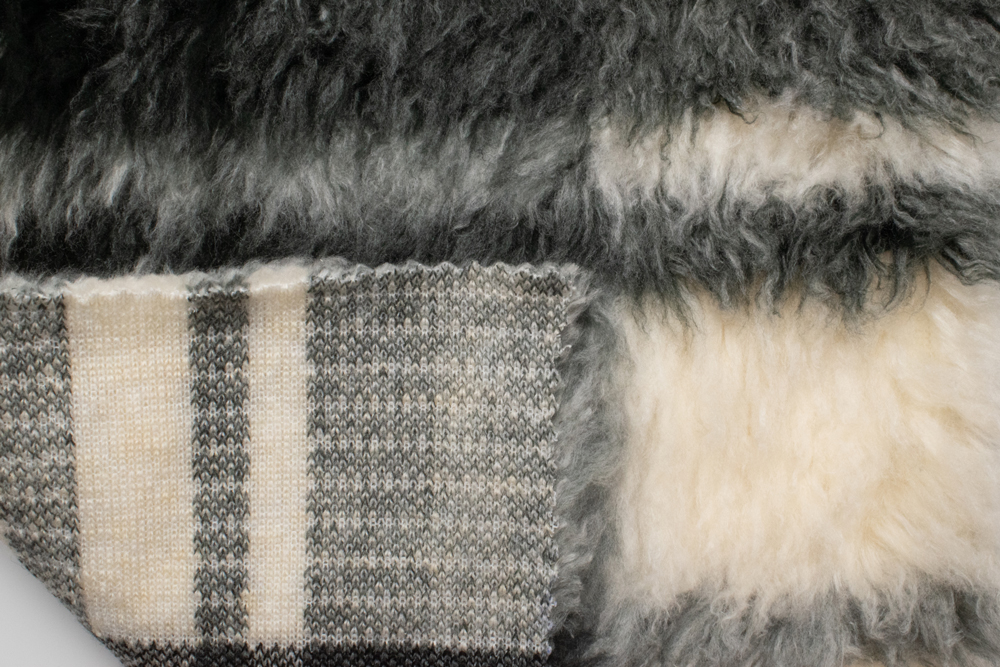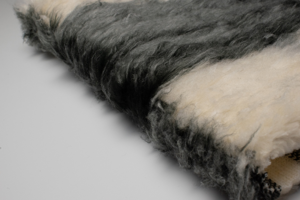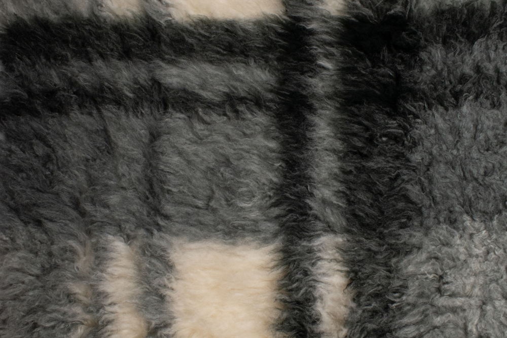 М’яке штучне хутро під «овчину» з великим клітинчастим мотивом у графітово-сірій та молочній гамі. Середній ворс 20 мм має легку хвилясту фактуру, завдяки чому матеріал виглядає об’ємно та добре тримає тепло. Щільна трикотажна основа стабільна, не розсипається по зрізу й комфортно працює у пошитті верхнього одягу.