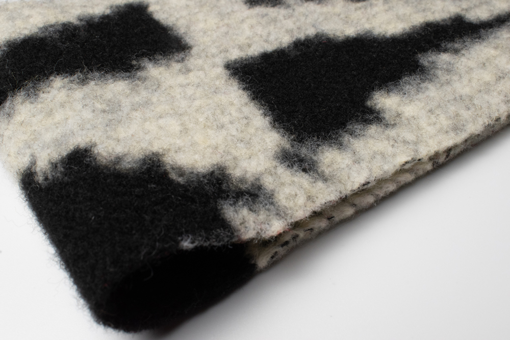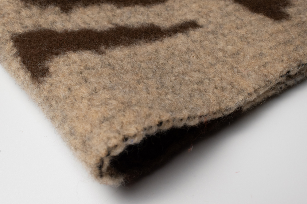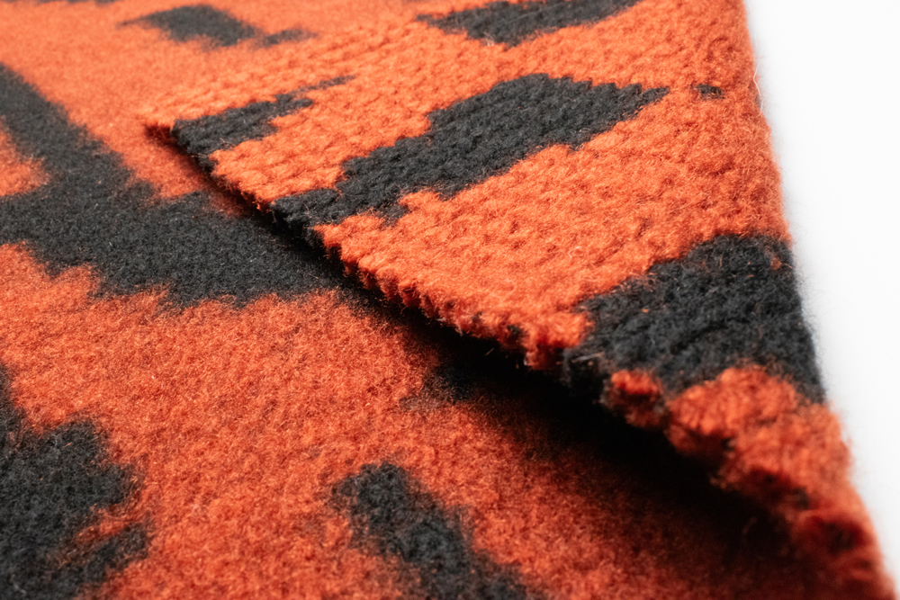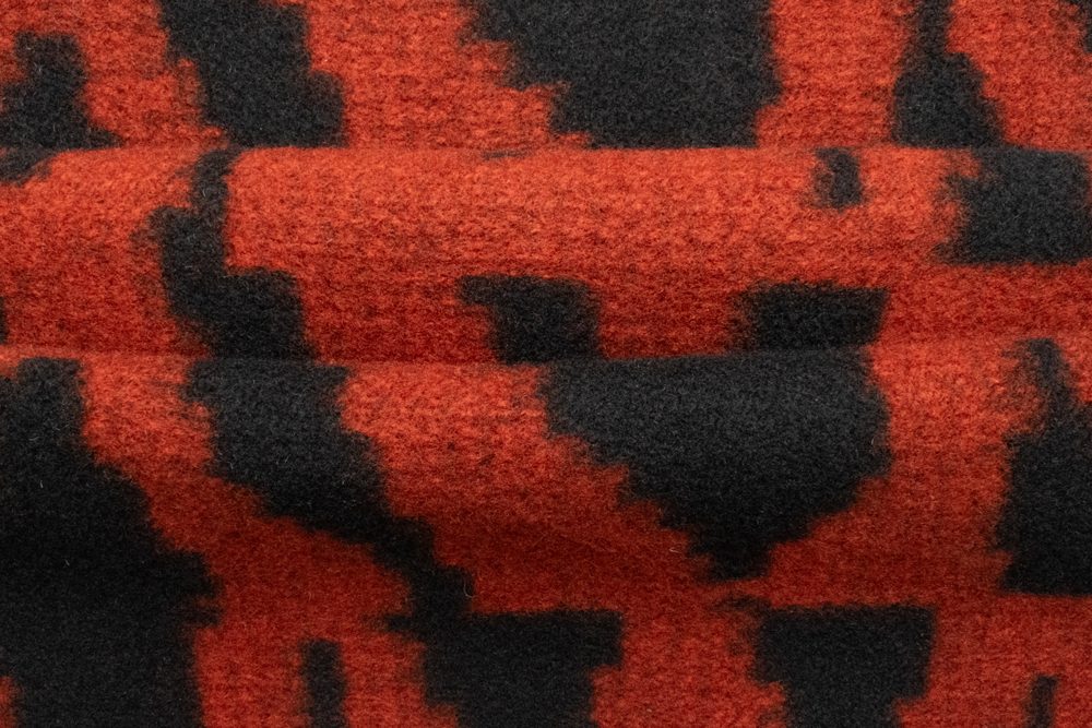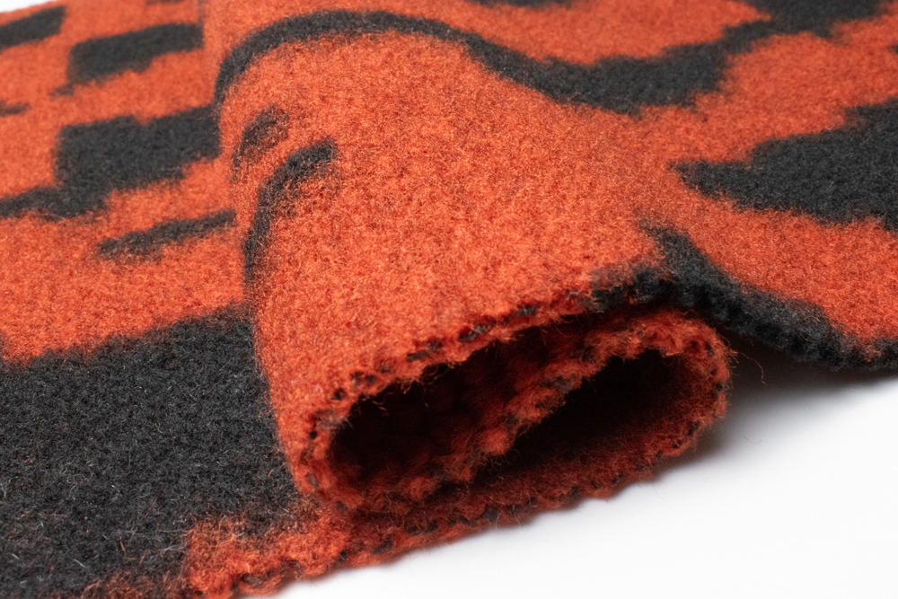 Щільний пальтовий трикотаж, створений за допомогою жакардового плетіння з використанням пряжі різних кольорів. Завдяки цьому малюнок не нанесений поверхнево, а інтегрований у саме полотно, що забезпечує довговічність та виразний об’ємний ефект. Контрастні поєднання відтінків (червоний із чорним, бежевий з коричневим, зелений із сірим тощо) створюють сучасний дизайн із багатою кольоровою грою. Полотно тримає форму, тепле й комфортне завдяки вмісту вовни. Можливе виготовлення у потрібному кольорі за Pantone або вашим зразком.