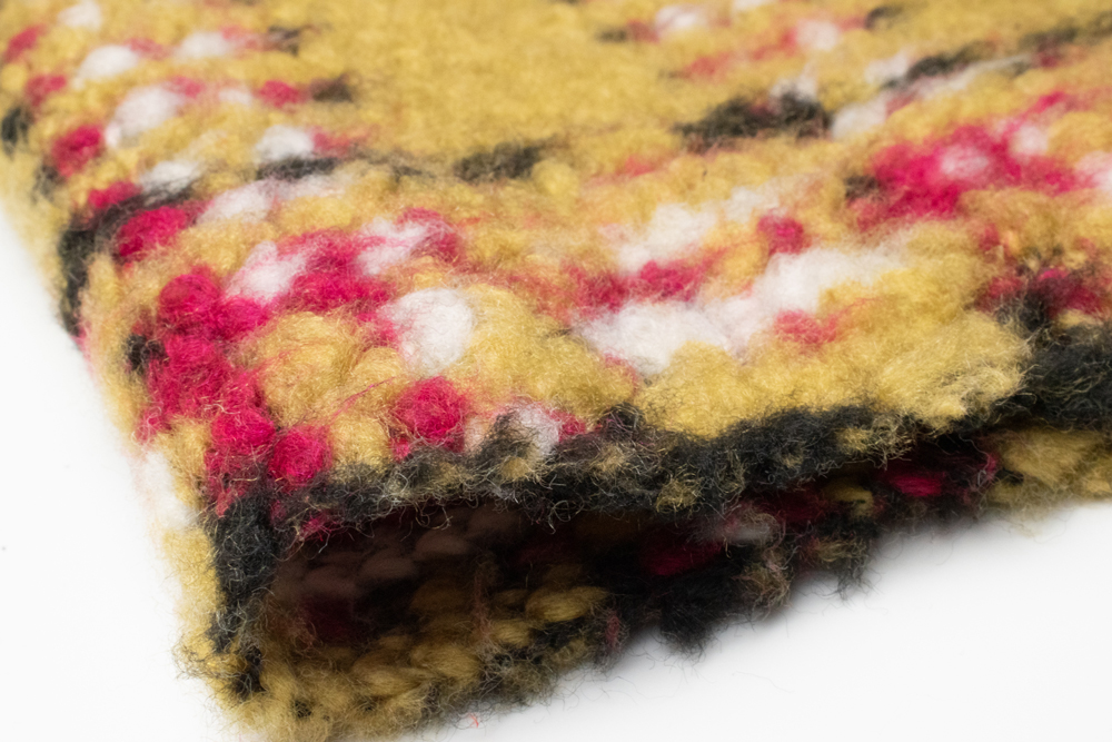 Щільне штучне хутро з коротким прямим ворсом (ST) і виразним клітинковим візерунком у гірчичному тоні з чорними, білими та червоними вкрапленнями. Текстура нагадує щільну вовняну тканину з легким об’ємом, добре тримає форму й виглядає структурно на виробах. Виворіт — міцна трикотажна основа, що забезпечує стабільність полотна, акуратні шви та довговічність. Підходить для пальт, курток, жакетів, спідниць, сумок та аксесуарів. Можемо підібрати інший колір комбінації клітинки за Pantone або вашим зразком, а також масштабуємо малюнок під техзавдання.
