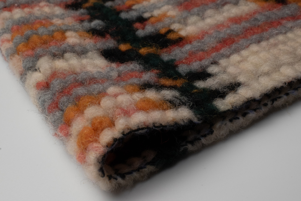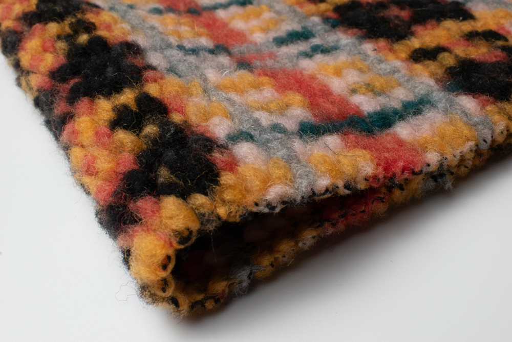 Щільний пальтовий трикотаж із прямим ворсом та яскравим клітинковим візерунком у поєднанні гірчичного, червоного, зеленого та чорного кольорів. Поверхня м’яка й об’ємна завдяки ворсу, що додає фактурності. Полотно щільне, добре тримає форму, але водночас еластичне завдяки трикотажній основі. Класичний дизайн клітинки робить тканину універсальною для верхнього одягу в сучасному та ретро-стилі. Можливе виготовлення у потрібному кольорі за Pantone або вашим зразком.